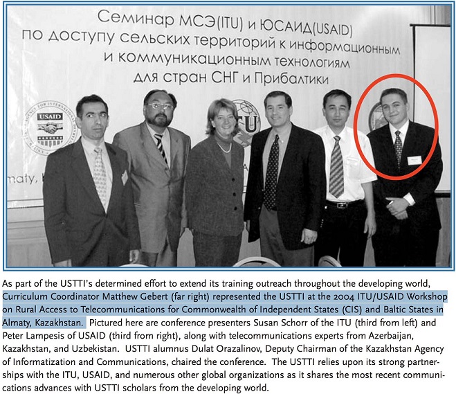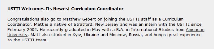 The USTTI is funded jointly by private industry and the following government agencies: U.S. Department of Commerce, National Telecom and Information Administration (NTIA), U.S. Department of Justice (DOJ), Federal Communications Commission (FCC), National Aeronautics and Space Administration (NASA), National Public Radio (NPR) National Oceanic and Atmospheric Administration (NOAA) and of course the State Department. Below is a snapshot from archive.org of their website announcement of Gebert's joining the team. Having been overseas to Russia and the Ukraine, and working with foreign nationals on telecommunications infrastructure and policy training issues during the lead up to the invasion of Iraq one would think he got a security clearance in that the most paranoid of all times.